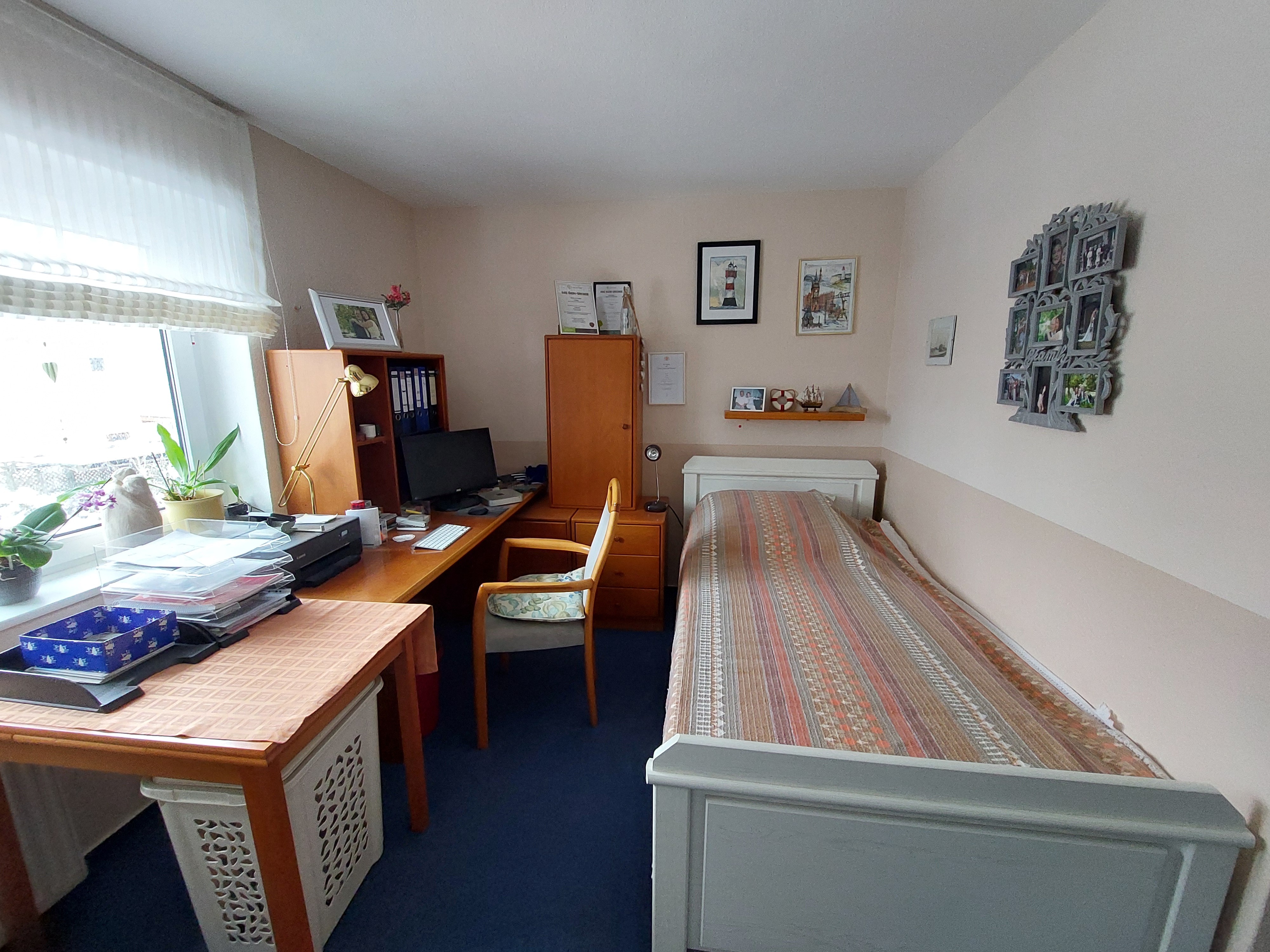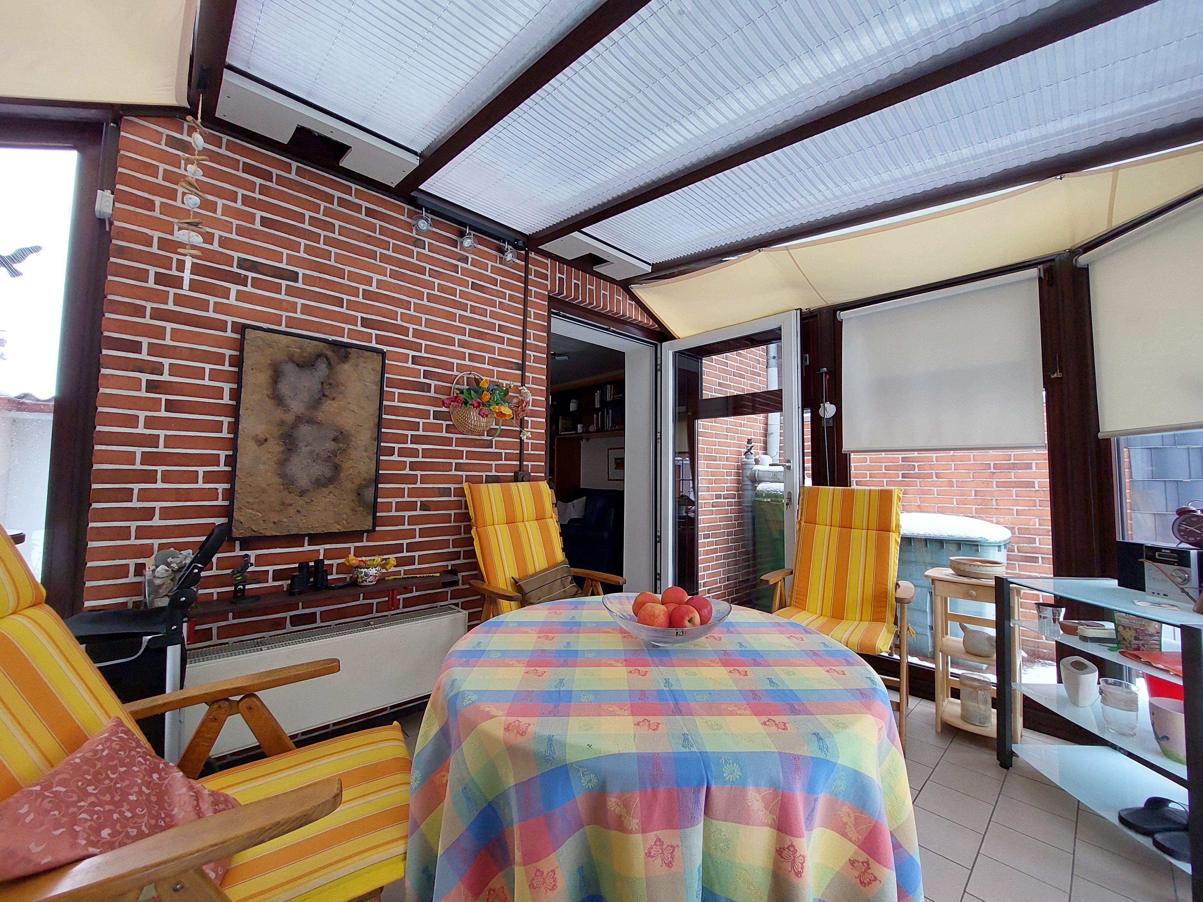 Im Erdgeschoss liegen Küche und Wohnzimmer mit dem Mitte der 90er Jahre erschaffenen Wintergarten. Im Obergeschoss befinden sich das sanierte Bad und zwei Schlafräume.